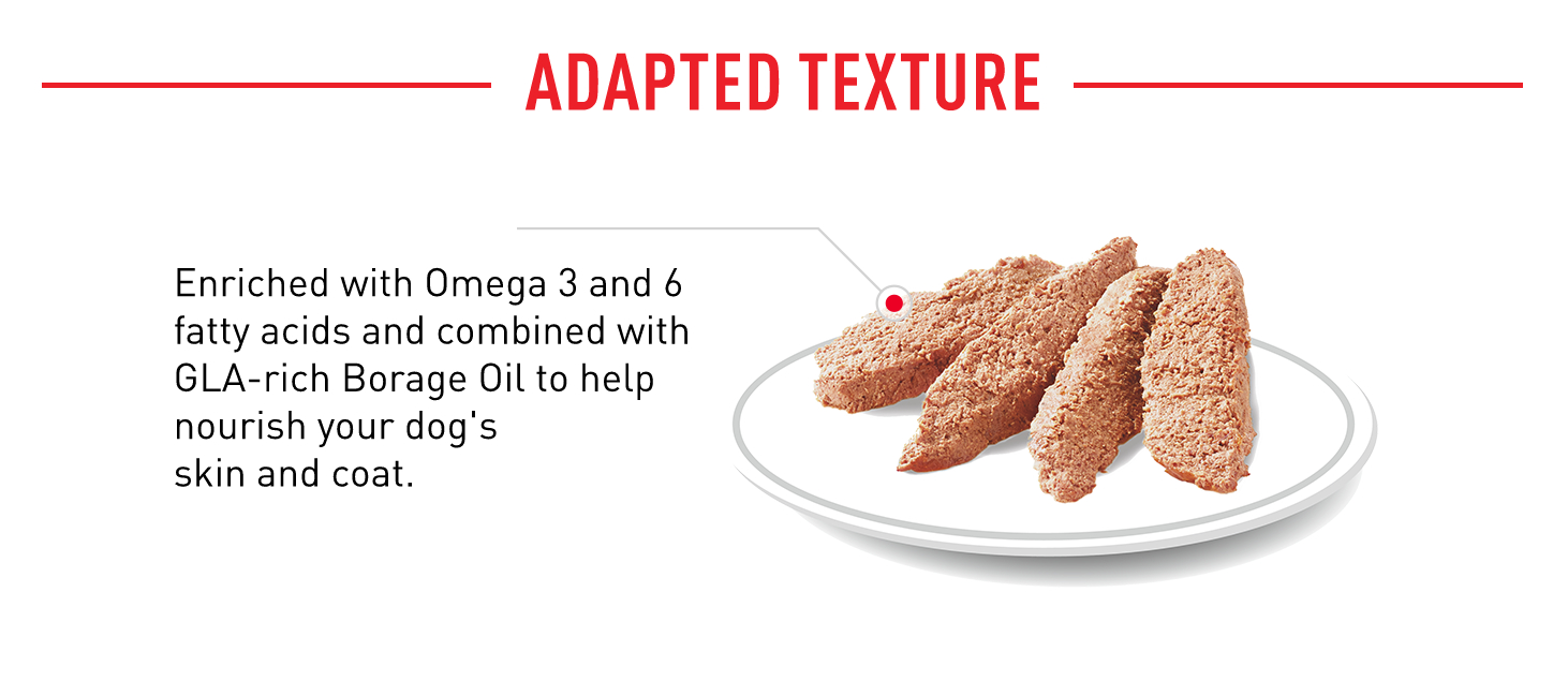 This food is enriched with fatty acids Omega 3 and 6, as well as GLA-rich Borage Oil. These nutrients help to nourish your dog’s skin and coat. What’s more, melanin precursors tyrosine and phenylalanine are also included in ROYAL CANIN® Coat Care Loaf’s exclusive formula; these nutrients work to intensify your dog’s coat color.